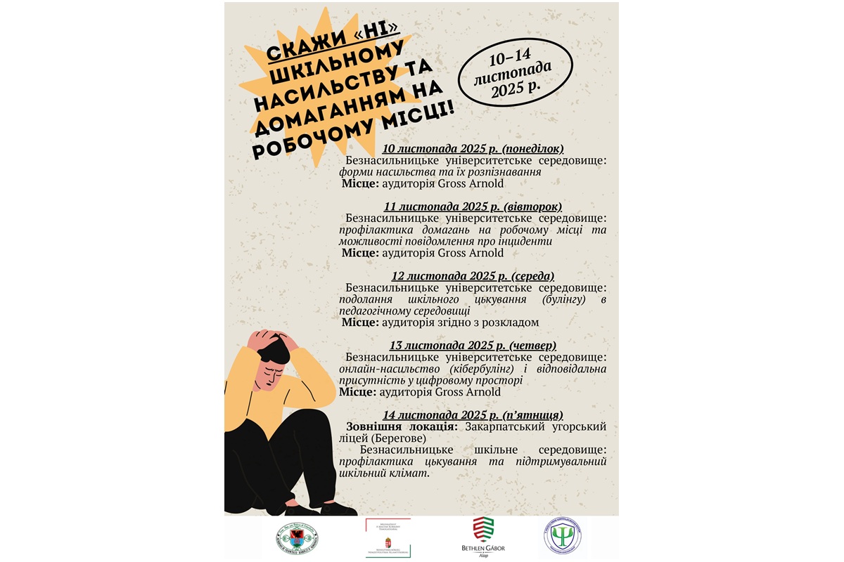 - 12 листопада 2025 року (середа) – Університетське середовище без насильства: протидія та реагування на випадки шкільного насильства (булінгу) в педагогічному аспекті (аудиторія «Терекбалінт»)