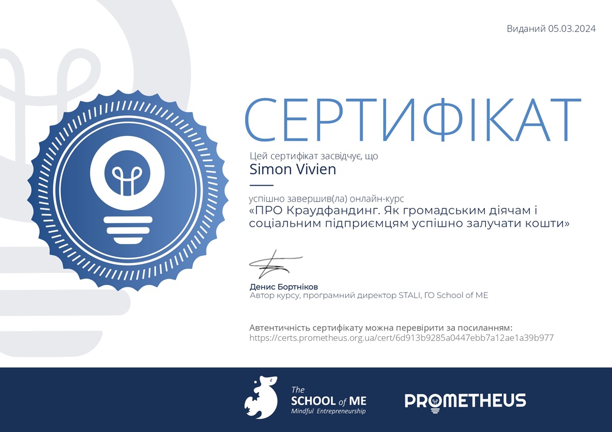 Студенти – бакалаври 4 курсу під час вивчення дисципліни за вибором «Фінанси малого бізнесу» успішно завершили навчання та отримали сертифікати з курсу «ПРО Краудфандинг. Як громадським діячам та соціальним підприємцям успішно залучати кошти», який запропонований платформою масових відкритих онлайн-курсів Prometheus (автор – Ден Бортніков, ГО School of Mindful Entrepreneurship).
