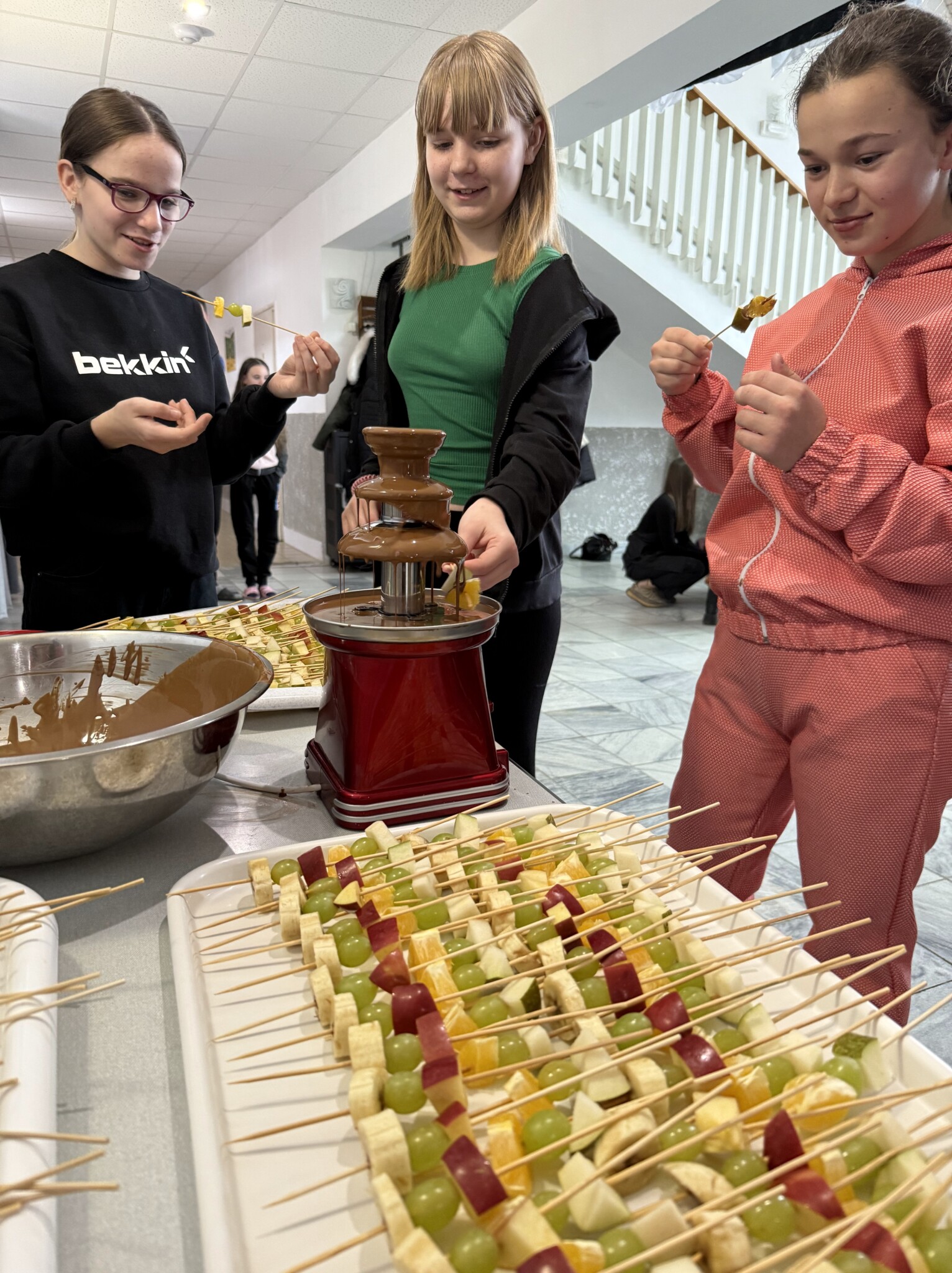 Одним із найулюбленіших моментів заходу став шоколадний фонтан, приготований студентами напрямку підготовки «Пекар». Діти із захопленням занурювали свіжі фрукти та зефір у розтоплений шоколад, насолоджуючись солодощами та спільним дозвіллям. Ця частина програми стала справжнім сюрпризом і викликала щирі посмішки на обличчях усіх присутніх.