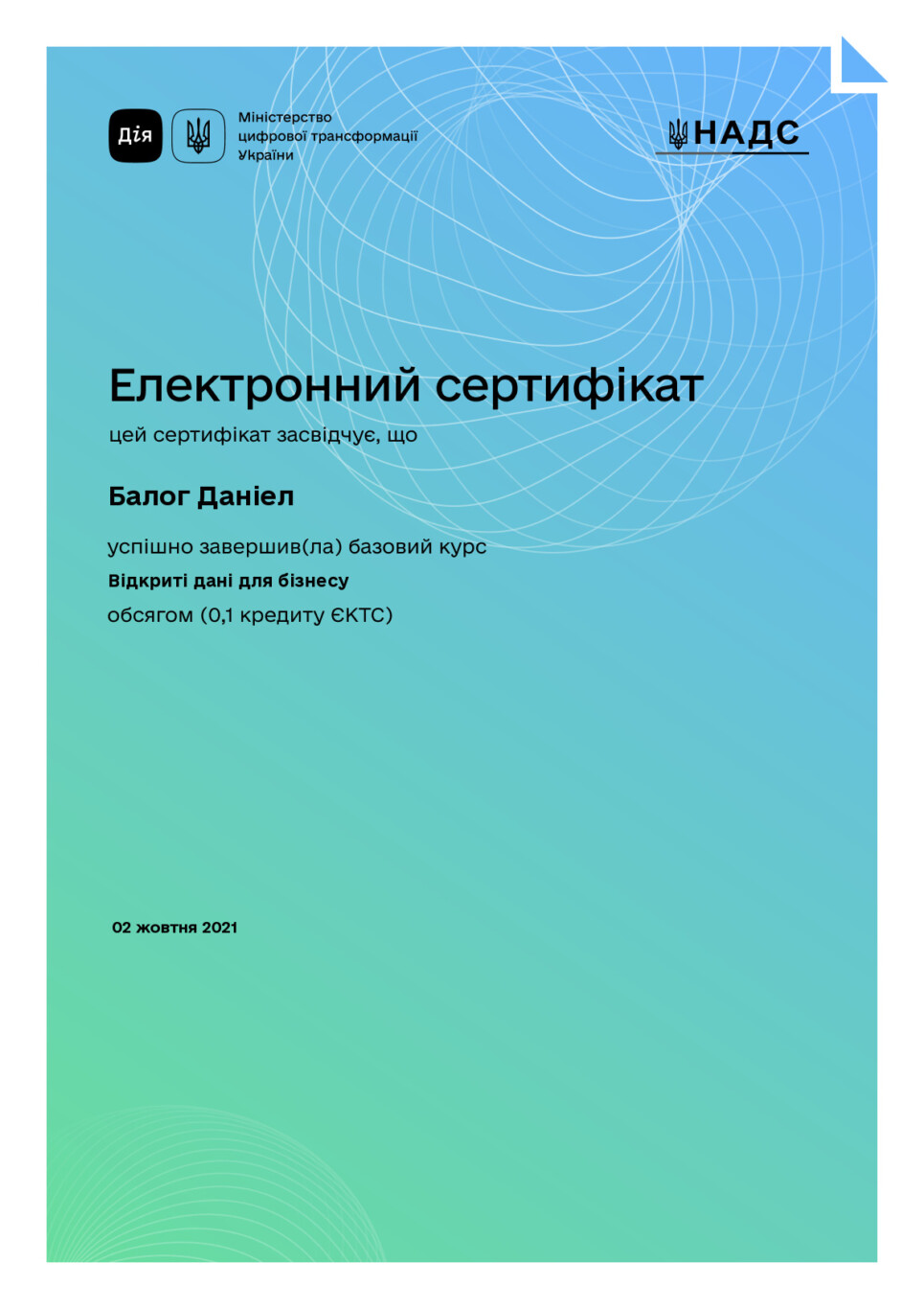Вже традиційно здобувачі вищої освіти кафедри обліку і аудиту ЗУІ 24 вересня 2021 р. в рамках дисципліни “Інформаційні системи і технології в обліку та аудиті” пройшли на Національній онлайн платформі “Дія. Цифрова освіта” курс “Відкриті дані для бізнесу”.