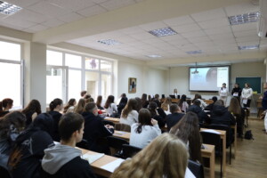 Присутні послухали доповідь здобувачів освітнього рівня В11 Філологія (Українська й угорська мови: переклад) Регіни Жовчак та Ванесси Вархол, які поділилися зі слухачами цікавими фактами про Радіодиктант національної єдності. Авторкою тексту Радіодиктанту 2025 року була Євгенія Кузнєцова, українська письменниця, перекладачка та науковиця. Текст диктанту прочитала Наталія Сумська, народна артистка України, провідна акторка та телеведуча.
