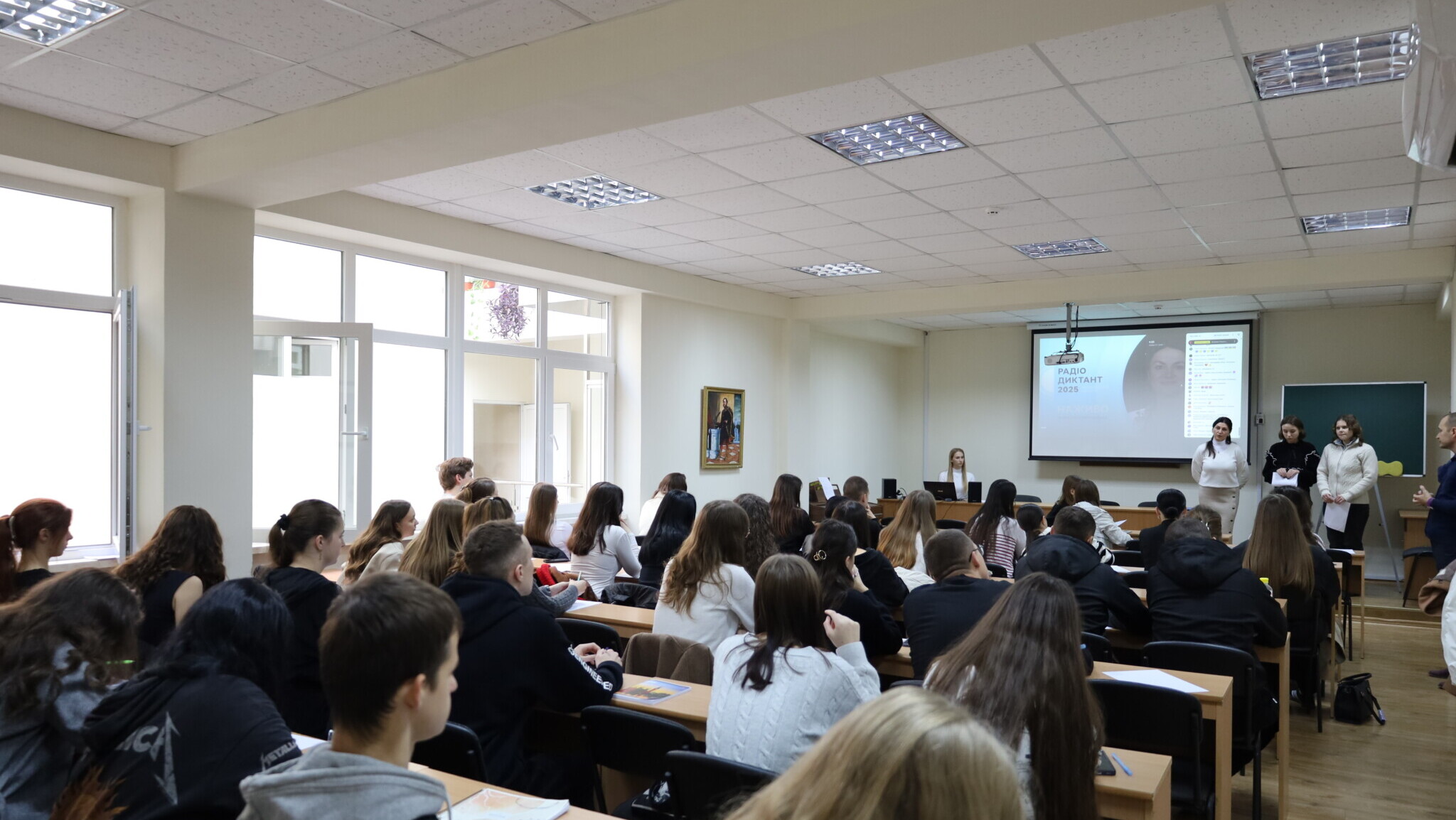Присутні послухали доповідь здобувачів освітнього рівня В11 Філологія (Українська й угорська мови: переклад) Регіни Жовчак та Ванесси Вархол, які поділилися зі слухачами цікавими фактами про Радіодиктант національної єдності. Авторкою тексту Радіодиктанту 2025 року була Євгенія Кузнєцова, українська письменниця, перекладачка та науковиця. Текст диктанту прочитала Наталія Сумська, народна артистка України, провідна акторка та телеведуча.