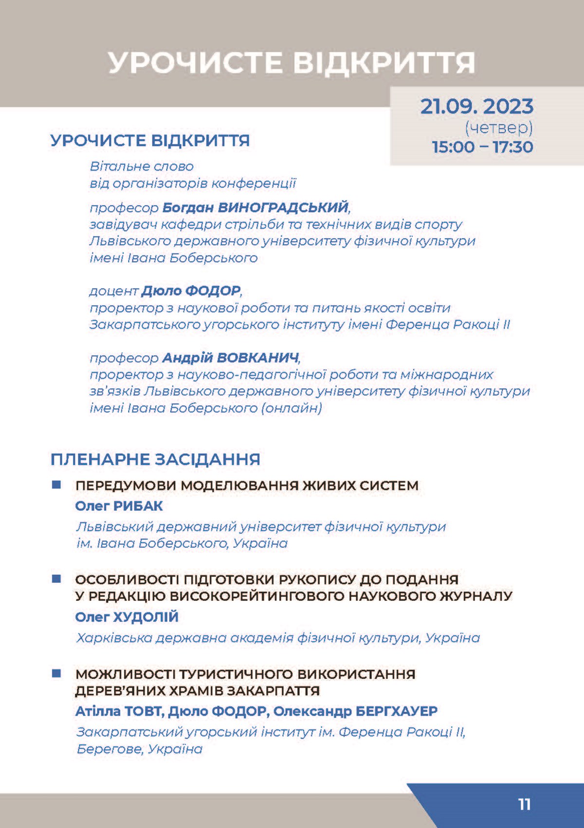 Урочисте відкриття першого дня конференції відбудеться 21 вересня, о 15:00 (за київським часом). Вітальні промови виголосять завідувач кафедри стрільби та технічних видів спорту Львівського державного університету фізичної культури імені Івана Боберського професор Богдан Виноградський, проректор з наукової роботи та питань якості освіти Закарпатського угорського інституту імені Ференца Ракоці ІІ Дюло Фодор, проректор з науково-педагогічної роботи та міжнародних зв’язків Львівського державного університету фізичної культури професор Андрій Вовканич.