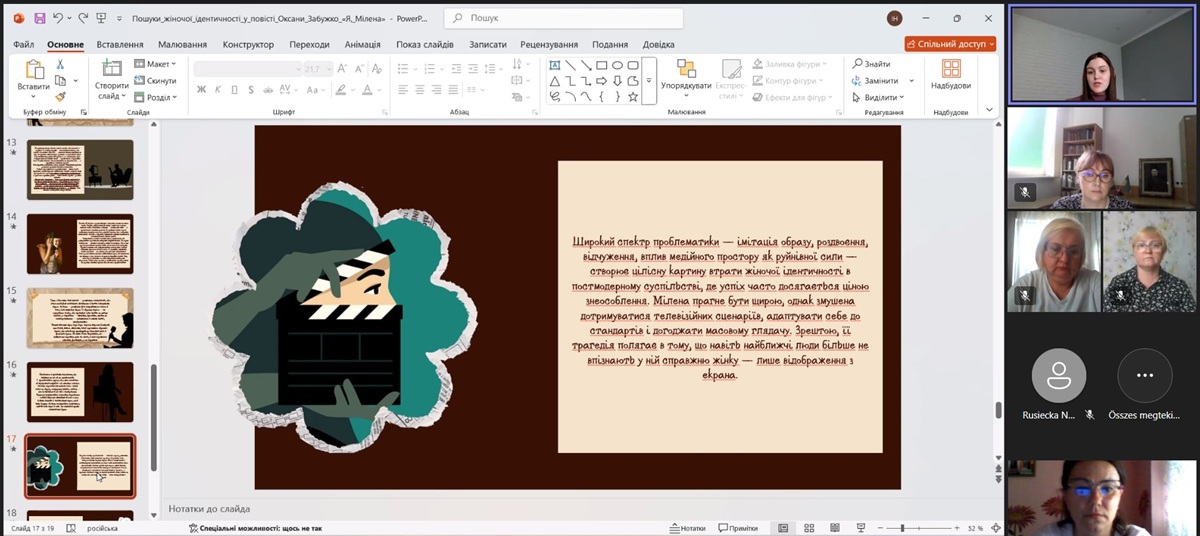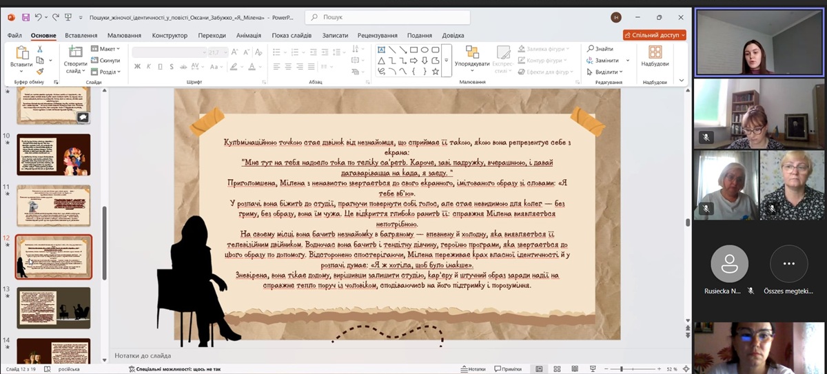 Ірина Немеш і Тетяна Чонка виголосили доповідь на тему «Пошуки жіночої ідентичності у повісті Оксани Забужко «Я, Мілена», Адальберт Барань та Єлизавета Барань ознайомили слухачів із сучасним станом угорської україністики.