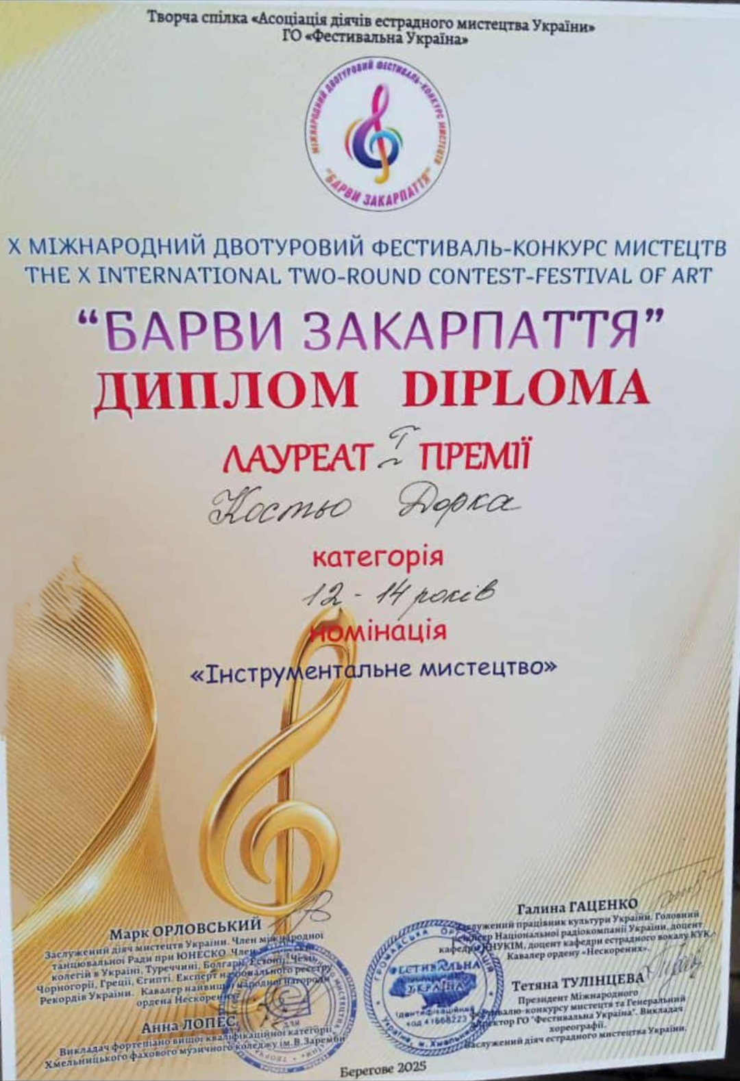 За результатами конкурсу учениця Берегівської початкової школи мистецтв «Туліпан Танода» Дорка Костьо здобула 1 місце в категорії «Соліст».