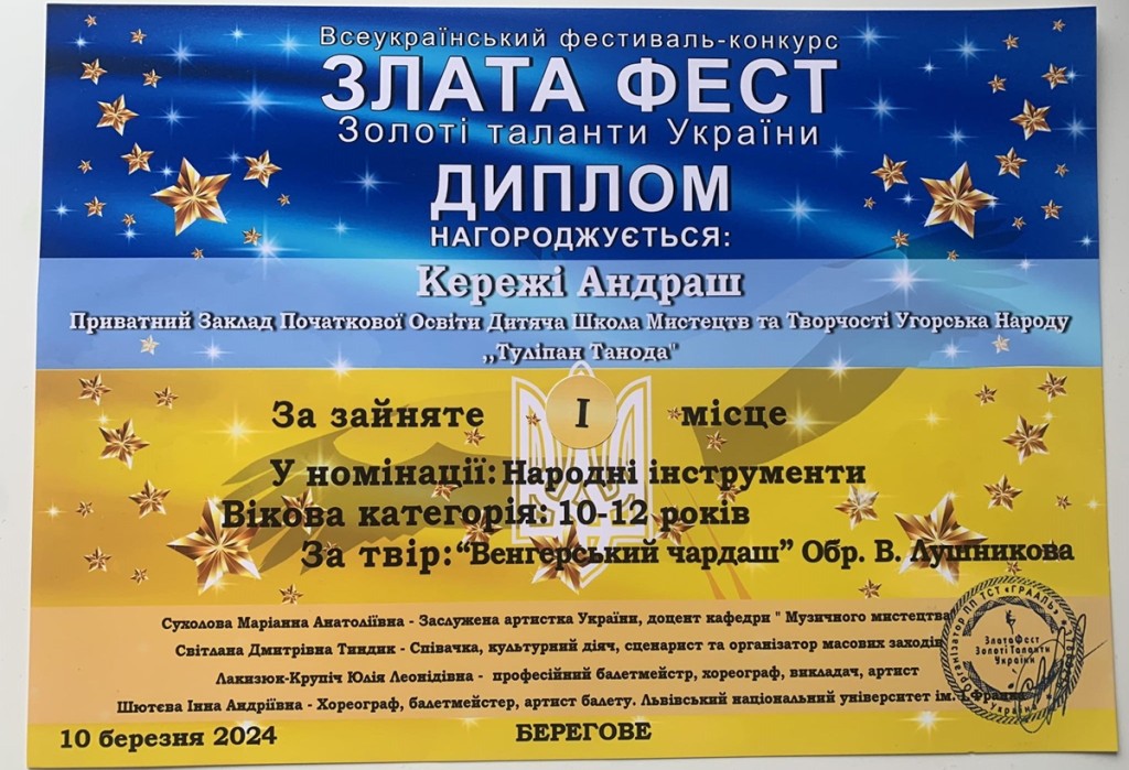 Вихованець ПЗ «ДШМ “Туліпан Танода”» зайняв перше місце на Всеукраїнському фестивалі «Злата Фест – Золоті таланти України»
