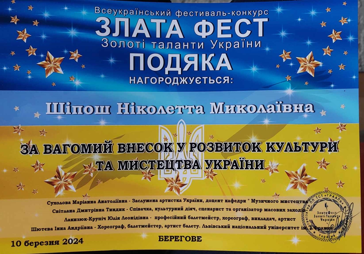 10 червня 2024 року відбувся Всеукраїнський фестиваль «Злата Фест – Золоті таланти України».