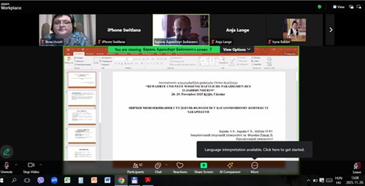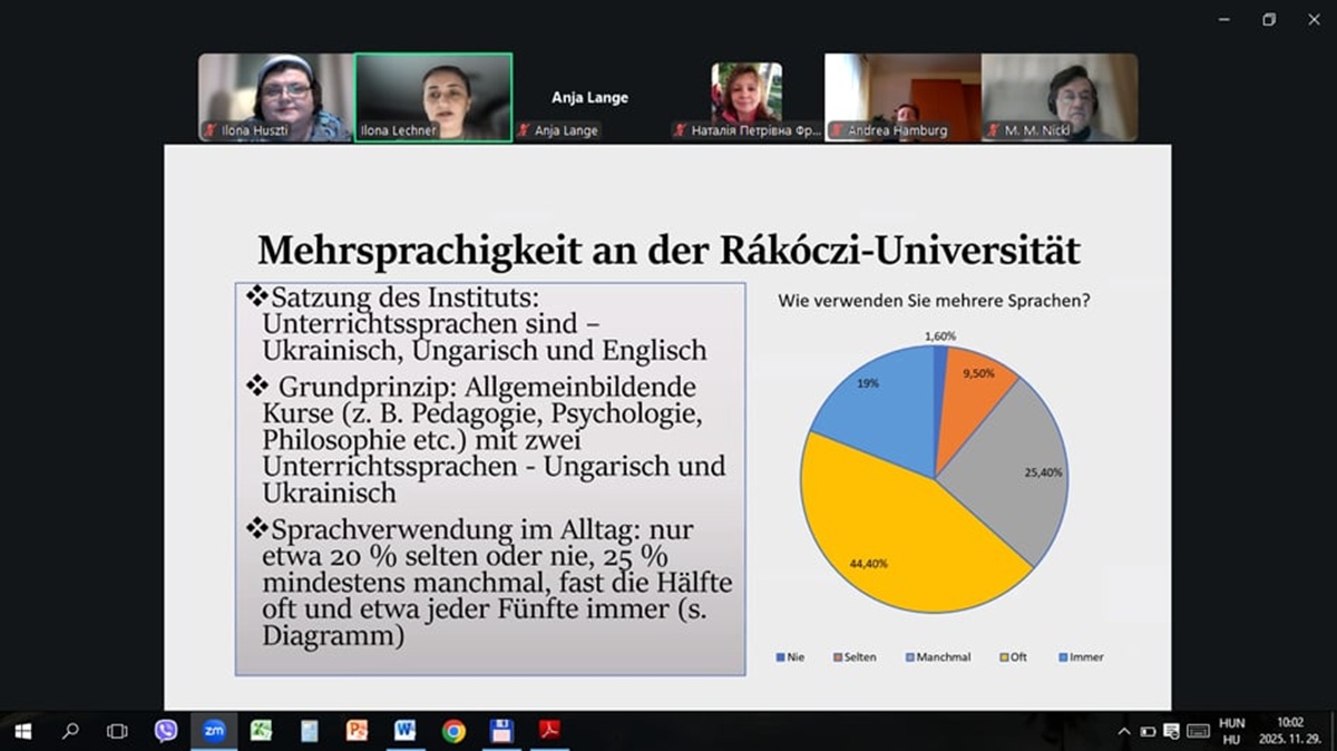 Викладачі кафедри філології представили результати дослідницьких проєктів № 4 та № 5 2025 року, які проводять на кафедрі філології. Доцентки Ілона Лехнер та Ілона Густі виголосили доповідь німецькою мовою на тему „Digitale Tools im Sprachunterricht von mehrsprachigen Studierenden”) [Цифрові інструменти у навчанні мови багатомовних студентів]. Доценти Адальберт Барань, Єлизавета Барань та Марта Фабіян озвучили доповідь українською мовою на тему «Звички мововживання студентів-філологів у багатомовному контексті Закарпаття».