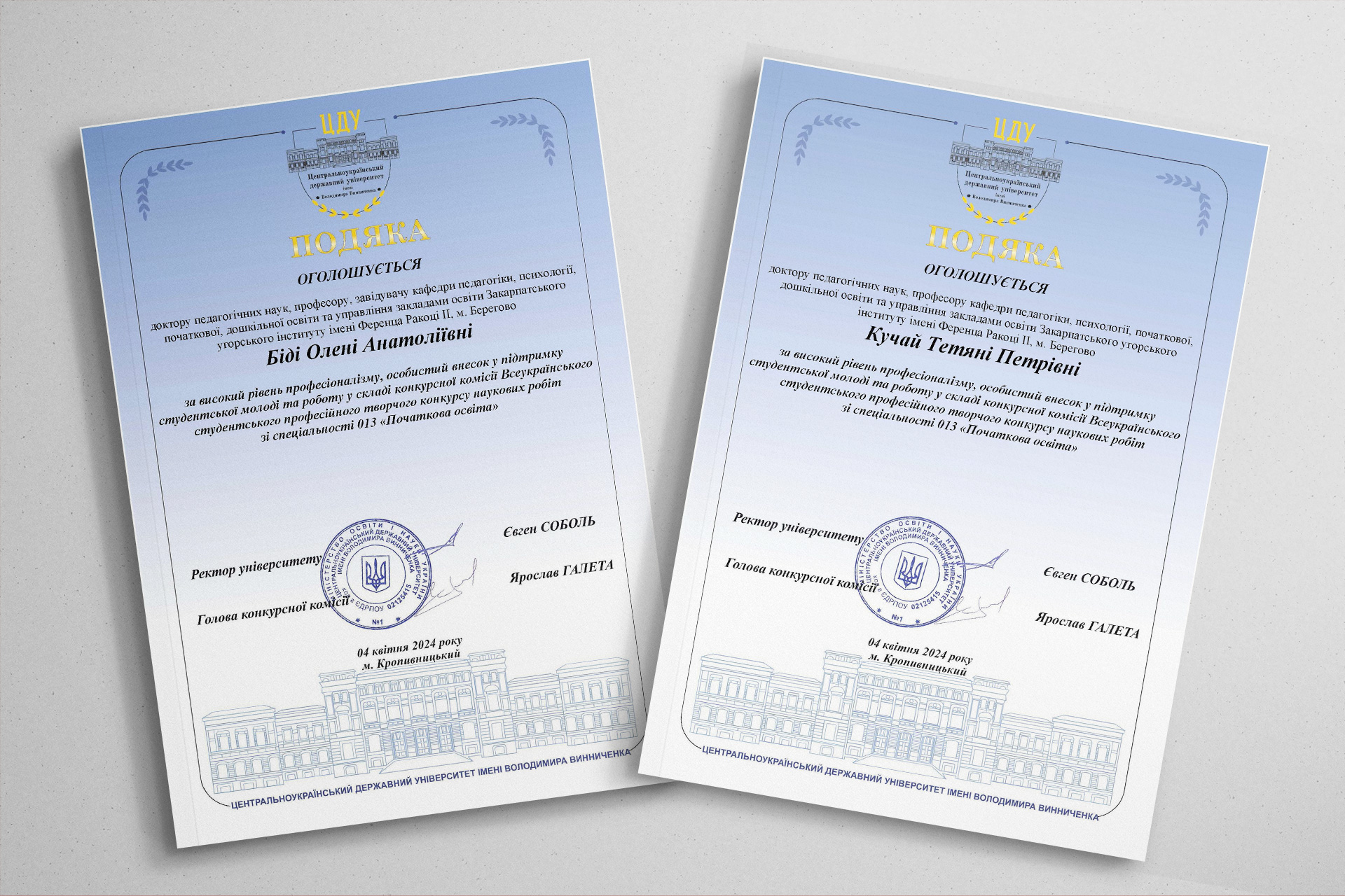Біді Олені Анатоліївні, доктору педагогічних наук, професору, завідувачки кафедри педагогіки, психології, початкової, дошкільної освіти та управління закладами освіти ЗУІ та Кучай Тетяні Петрівні, доктору педагогічних наук, професора кафедри педагогіки, психології, початкової, дошкільної освіти та управління закладами освіти ЗУІ оголошена подяка від професора Євгена Соболя, ректора Центральноукраїнського державного університету імені Володимира Винниченка та Ярослава Галети, голови конкурсної комісії «за високий рівень професіоналізму, особистий внесок у підтримку студентської молоді та роботу у складі конкурсної комісії Всеукраїнського студентського професійного творчого конкурсу наукових робіт зі спеціальності 013 Початкова освіта».