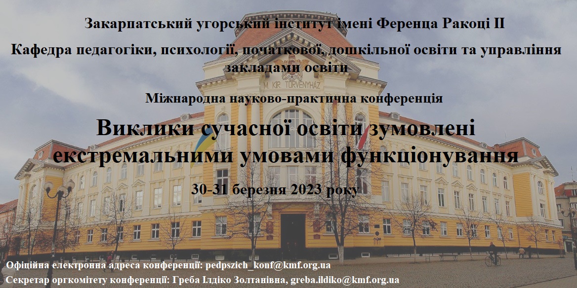 Кафедра педагогіки, психології, початкової, дошкільної освіти та управління закладами освіти Закарпатського угорського інституту імені Ференца Ракоці ІІ запрошує охочих взяти участь у Міжнародній науково-практичній конференції «Виклики сучасної освіти зумовлені екстремальними умовами функціонування», яка відбудеться 30-31 березня 2023 року.