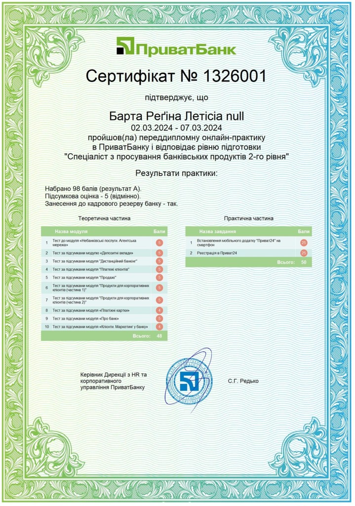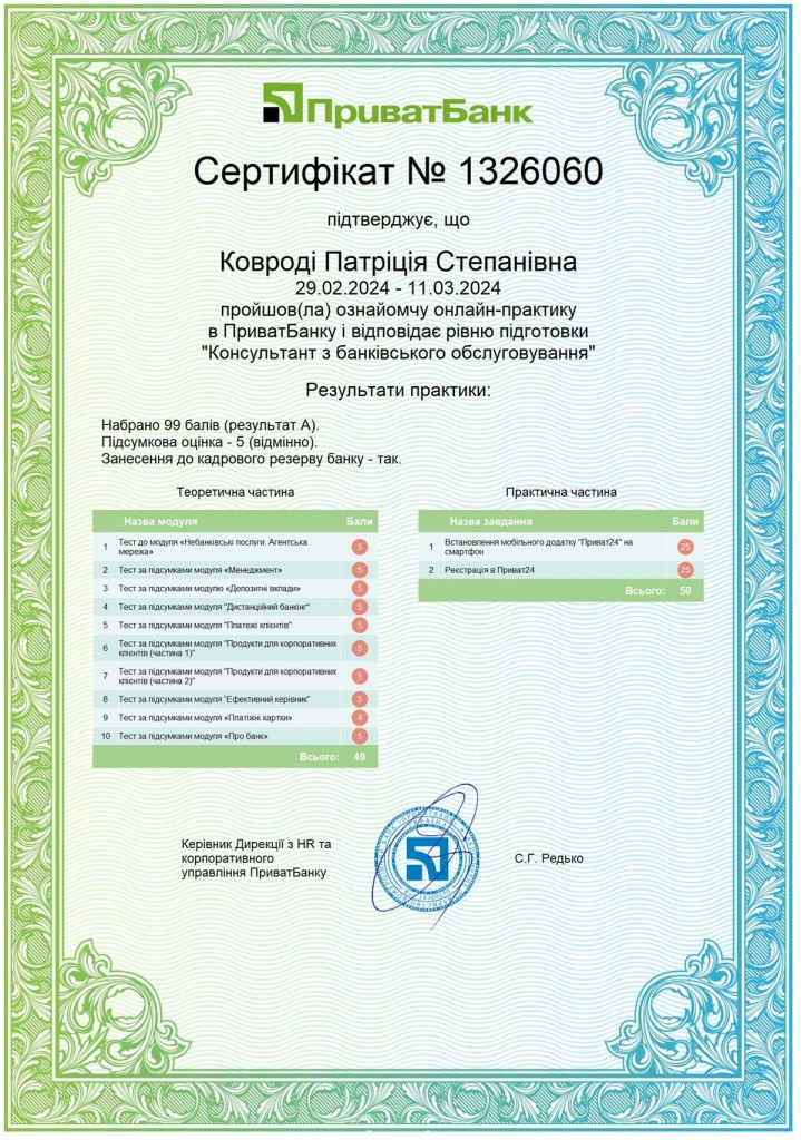 Протягом березня 2024 року в рамках дисципліни “Облік у банках” здобувачів вищої освіти 4 курсу долучили до проходження  онлайн-практики в АТ “Приватбанк”.