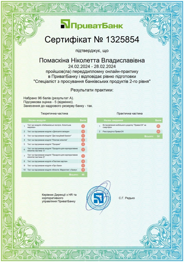 За результатами проходження практики здобувачі освіти-практиканти отримали сертифікати, які засвідчили високий рівень підготовки. За умови успішного закінчення практики здобувачі освіти мають можливість подальшого працевлаштування в АТ «ПриватБанк». Найкращих студентів включено до кадрового резерву банку.