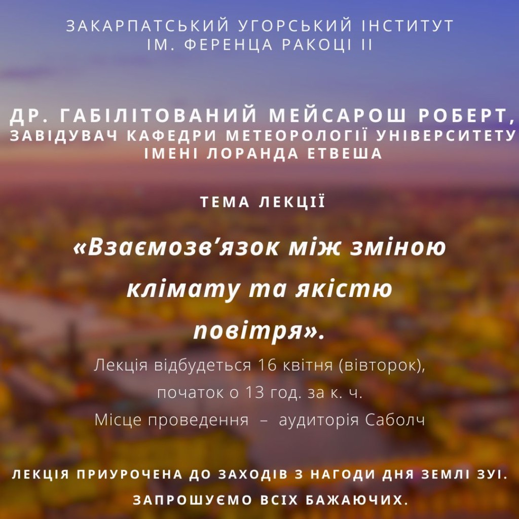 16 квітня 2024 року о 13 год. за к. ч. в аудиторії Саболч Закарпатського угорського інституту імені Ференца Ракоці ІІ проводитиметься лекція габілітованогодоктора Роберта Мейсароша, завідувача кафедри метеорології Університету імені Лоранда Етвеша (м. Будапешт, Угорщина).