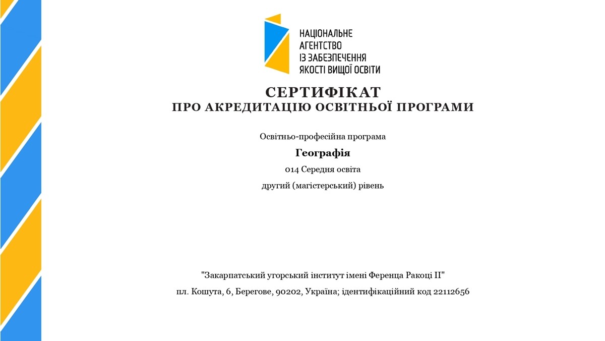 Згідно рішення Національного агентства із забезпечення якості вищої освіти від 28.03.2024 р. Закарпатському угорському інституті ім. Ф.Ракоці ІІ видано сертифікат про акредитацію освітньо-професійної програми «Географія» другого (магістерського) рівня вищої освіти на п’ятирічний термін, що реалізується кафедрою географії та туризму.