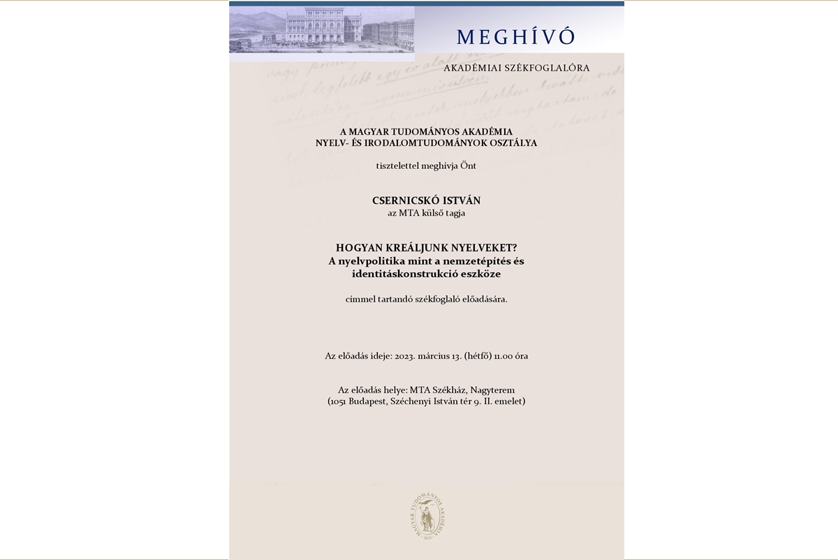13 березня 2023 року від 12:00 у Великій залі головного корпусу Угорської академії наук відбудеться інавгураційна промова Черничко Степана Степановича, ректора ЗУІ, професора мовознавства Кафедри Філології під назвою «Як можна створювати мови? Мовна політика як інструмент будування нації і побудови ідентичності».