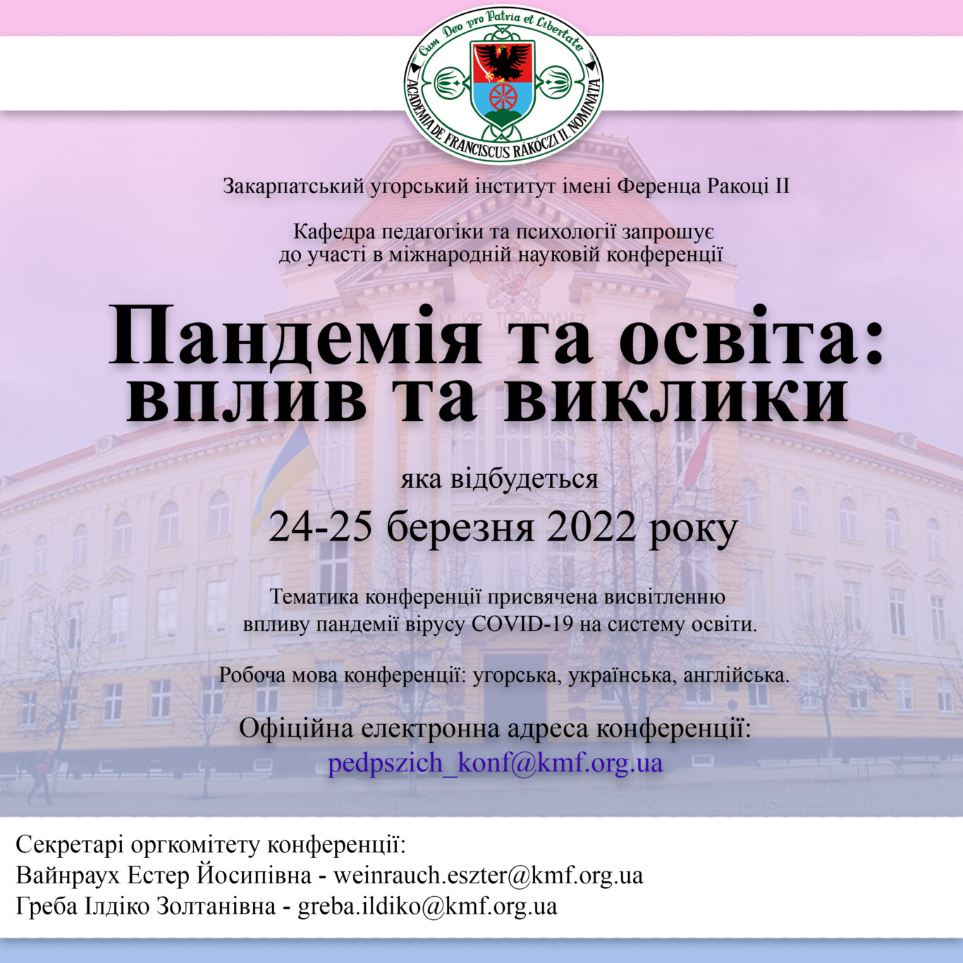 Кафедра педагогіки та психології запрошує Вас взяти участь у роботі Міжнародної науково-практичної конференції на тему «Пандемія та освіта: вплив та виклики», яка відбудеться 24-25 березня 2022 року в Закарпатському угорському інституті імені Ференца Ракоці ІІ.