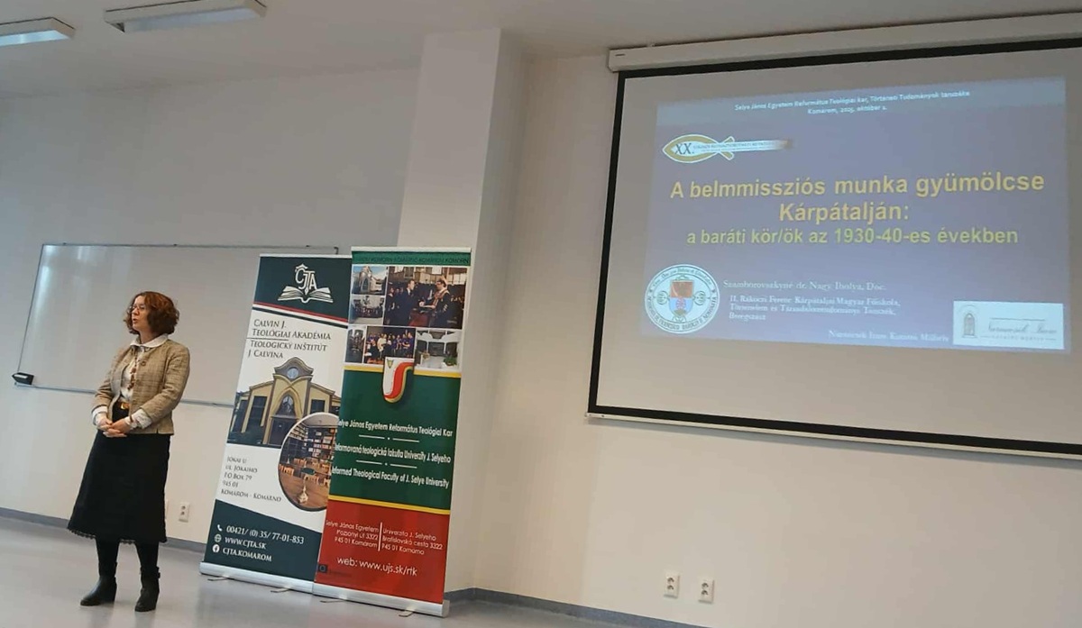 Кафедру історії та суспільних дисциплін представляла доцентка Ібоя Самборовскі-Нодь (канд. іст. наук, доктор філософії) із доповіддю на тему «Пліди внутрішньої місії на Закарпатті: коло друзів у 1930-х та 1940-х роках». Маріанна Сейкель, асистентка кафедри географії та туризму, виступила з доповіддю «Реформатські громади, позбавлені церков на Закарпатті в радянську епоху».