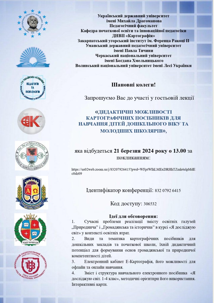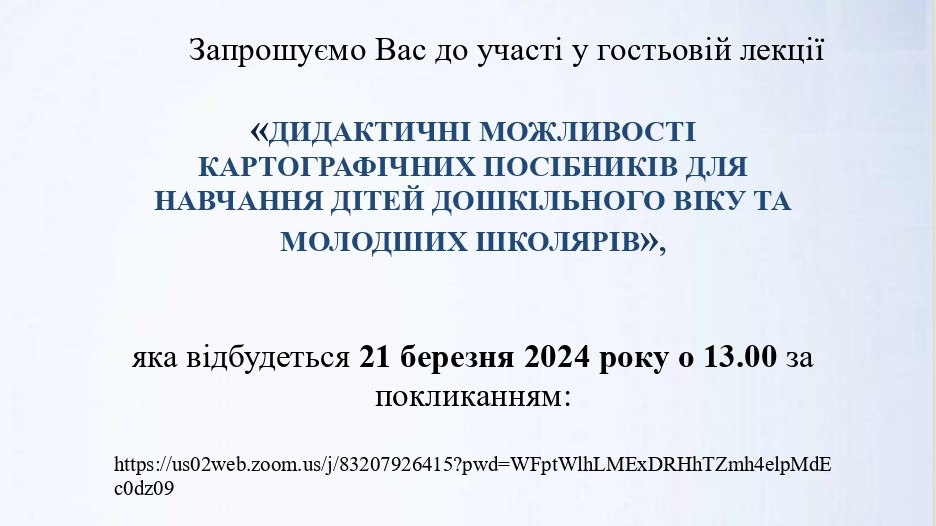 Шановні колеги! Запрошуємо вас на гостьову лекцію «Дидактичні можливості картографічних посібників для навчання дітей дошкільного віку та молодших школярів», яка відбудеться 21 березня 2024 року о 13:00 за посиланням:
