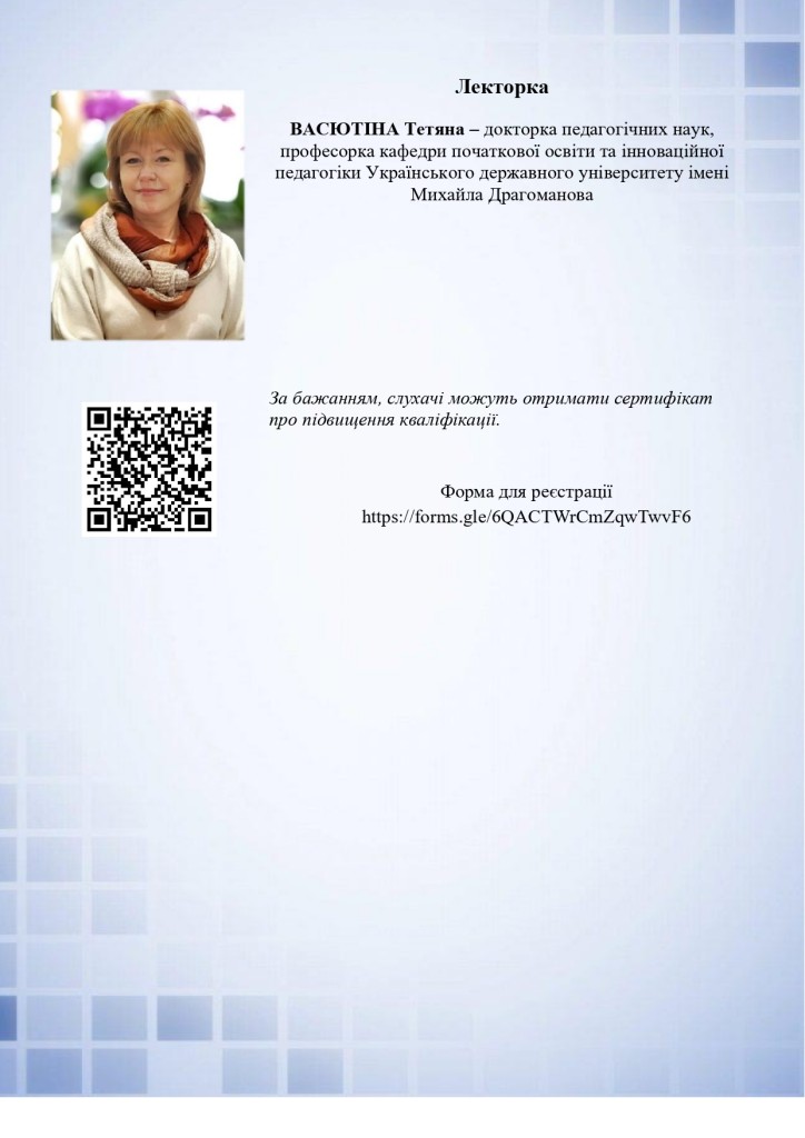 Лекторка: Васютіна Тетяна – докторка педагогічних наук, професорка кафедри початкової освіти та інноваційної педагогіки Українського державного університету імені Михайла Драгоманова.