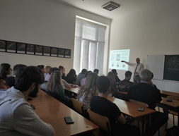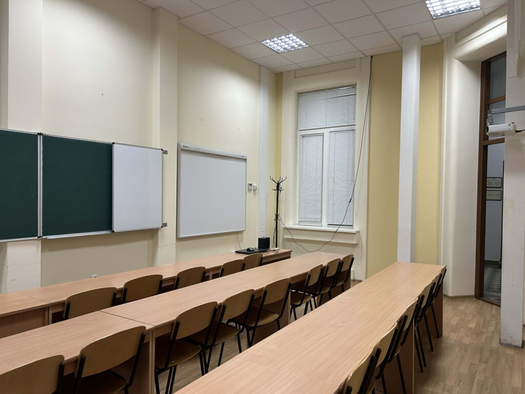 Лекційна аудиторія оснащена таким обладнанням: ноутбук, проєктор, інтерактивна дошка, традиційна письмова дошка.