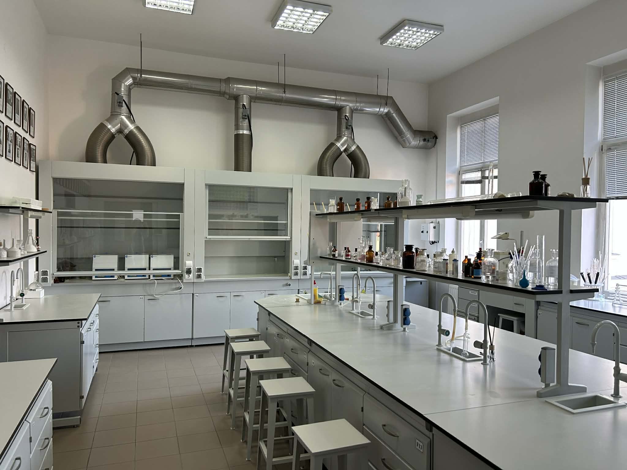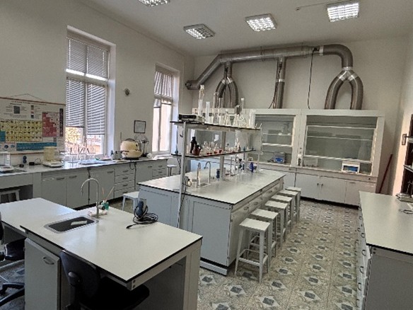 Оснащення лабораторії повністю відповідає вимогам сучасних хімічних навчальних приміщень. Для виконання досліджень доступні всі необхідні прилади, зокрема аналітичні ваги, різні типи водяних бань для проведення реакцій із контрольованою температурою, а також надійний дистиляційний апарат. Крім цього, лабораторія має повний набір як загальних, так і спеціалізованих інструментів, необхідних для органічних та біохімічних експериментів, а також для виконання фізико-хімічних вимірювань: скляний посуд, піпетки, мірні циліндри, хімічні стакани, холодильники для реакцій, штативи, магнітні мішалки та інше базове й спеціальне обладнання.