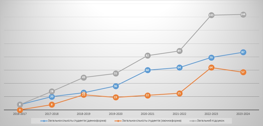 Найбільша динаміка росту спостерігається у період з 2021-2022 н.р. до 2022-2023 н.р. (збільшення на 60%), оскільки саме тоді вперше відбулося зарахування вступників на навчання за освітніми програмами «Фінансова безпека» (підготовка бакалаврів) і ОП «Міжнародний облік і оподаткування» (підготовка магістрів).