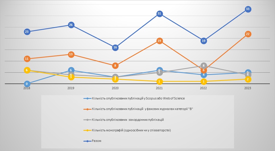 Діаграма (рис. 2) підсумовує результати основних наукових доробок професорсько-викладацького складу, які в середньому збільшуються на 7,5% щорічно. Крім того, щорічно викладачами кафедри було в середньому опубліковано 28 наукових статей у рецензованих виданнях України та за кордоном і тез конференцій. Протягом п’яти років загалом опубліковано 314 шт наукових досліджень.